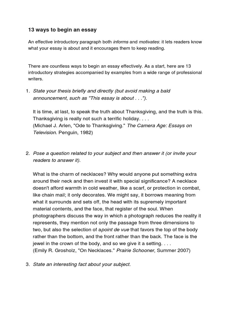 · Well, that’s what we call an effective hook. Basically, it is a catchy opening line that grabs a reader’s attention and makes them want to read further. A powerful hook and an engaging introduction are two key elements for success when writing an essay. If you may also be wondering how to write an introduction for an essay, continue to read on! Essay Structure. Writing an academic essay means fashioning a coherent set of ideas into an argument. Because essays are essentially linear—they offer one idea at a time—they must present their ideas in the order that makes most sense to a reader. Successfully structuring an essay means attending to a reader's logic · How to Begin an Essay: 13 Engaging Strategies State Your Thesis Briefly and Directly. But avoid making your thesis a bald announcement, such as "This essay is about Pose a Question Related to Your Subject. Follow up the question with an answer, or an invitation for your readers to State an Occupation: English And Rhetoric Professor